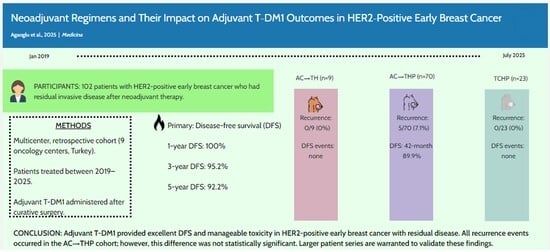 Despite these advances, uncertainty remains regarding how different neoadjuvant regimens influence subsequent outcomes with adjuvant T-DM1. Through the evaluation of clinical characteristics, treatment responses, and survival across different regimens, our study aims to determine whether the choice of neoadjuvant strategy modifies the consistent survival benefit of T-DM1 reported in clinical trials.