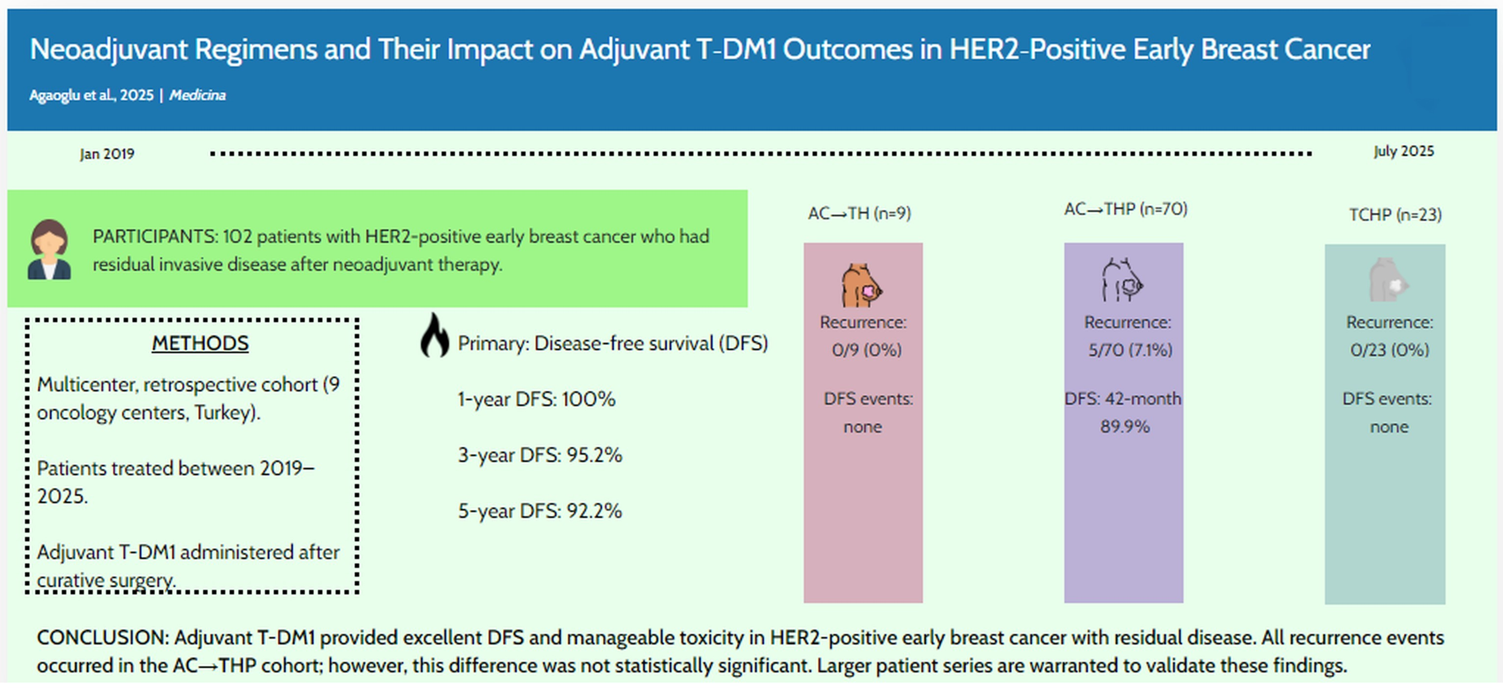 This multicenter study across nine oncology centers suggested that adjuvant T-DM1 is associated with favorable survival in individuals with early-stage HER2-positive breast cancer who had residual disease following neoadjuvant therapy. Survival outcomes appeared similar between patients treated with anthracycline-based and anthracycline-free regimens, indicating that the benefit of T-DM1 may extend across different therapeutic backbones in routine practice.