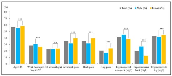 - Hoozemans, W.E.; can Poppel, M.N.M.; van der Beek, A.J.; Bongers, P.M.; van Mechelen, W. Gender differences in the relations between work-related physical and psychosocial risk factors and musculoskeletal complaints. Scand. J. Work. Environ. Health 2004, 30, 261–278. [Google Scholar] [CrossRef]