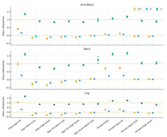 Across all three body regions, ergonomic risk × age > 45 showed synergy on the additive scale: the joint effect exceeded the sum of the separate effects (arm/neck: RERI ≈ 0.40, AP ≈ 0.16, SI ≈ 1.34; back: RERI ≈ 0.97, AP ≈ 0.27, SI ≈ 1.59; legs: RERI ≈ 1.03, AP ≈ 0.29, SI ≈ 1.67; all CIs excluded the null). In contrast, combinations of ergonomic risk with long working hours or with high job strain displayed antagonism (negative RERI/AP and SI < 1), with the largest attenuation for back and leg pain (e.g., ergo × work: RERI ≈ −0.28 to −0.32; ergo × strain: RERI ≈ −0.35 to −0.32). Interactions between age × long working hours and age × high job strain were modestly antagonistic across regions. The job strain × long working hours pair was near-null overall (CIs generally included the null; a small positive departure for back: RERI ≈ 0.05, SI ≈ 1.23) (Figure 2).