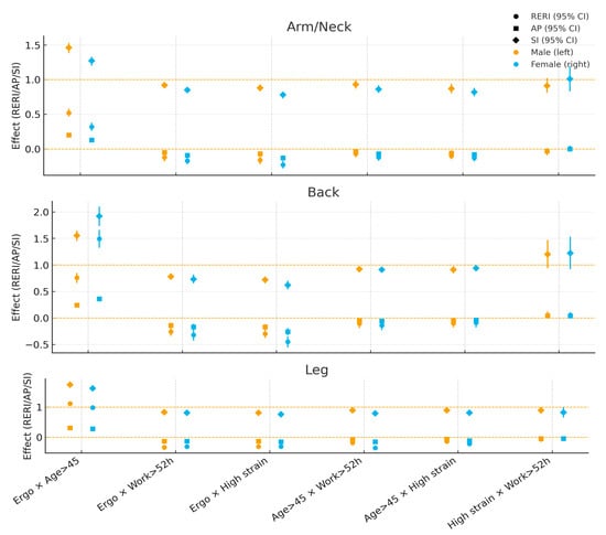 Patterns 45. showed the strongest synergy—for back pain in women (RERI ≈ 1.49; AP ≈ 0.36; SI ≈ 1.92) and for leg pain in men (RERI ≈ 1.11; AP ≈ 0.31; SI ≈ 1.74); for arm/neck pain, synergy was higher in men (RERI ≈ 0.52) than in women (≈0.32). Pairings of ergonomic risk with long working hours or high job strain were antagonistic in both sexes, with attenuation generally stronger in women, particularly for arm/neck and back (e.g., ergo × strain for back: women RERI ≈ −0.45, SI ≈ 0.62; men RERI ≈ −0.30, SI ≈ 0.72). Age × long working hours and age × high job strain also tended toward antagonism in both sexes, again somewhat higher in women (e.g., legs: age × work women RERI ≈ −0.35 vs. men ≈ −0.18). The job strain × long working hours pair remained close to null for both sexes (CIs overlapped the null) (Figure 3).