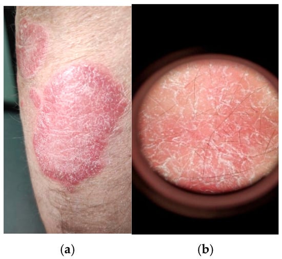 (a) Clinical examination of psoriasis vulgaris of a well-defined erythematous-to-scaly plaque, salmon-pink to bright red in color, covered with silvery-white, thick, multilayered, non-adherent scales; (b) conventional dermatoscopic examination (Dermatoscope Delta T ®, Heine Optotechnik GmbH & Co. KG, Gilching, Germany) showing silvery-white scales accompanied by dotted capillaries evenly distributed at the level of the plaque (own collection).