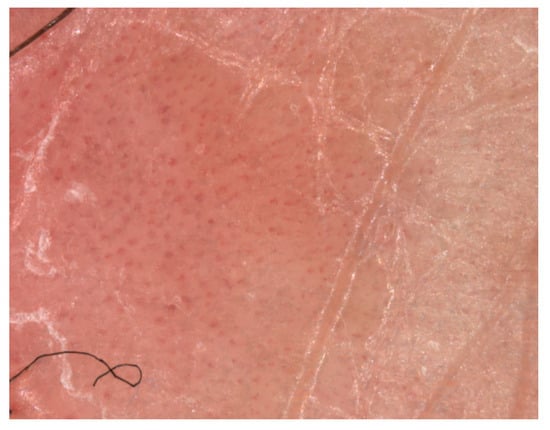 Dermatoscopy is a non-invasive diagnostic imaging method that consists of the in vivo examination of mucocutaneous lesions, providing a detailed visualization of the pigmentary and structural characteristics of the epidermis, the dermo-epidermal junction, and the superficial and middle dermis. This technique is widely used in the diagnosis and evaluation of mucocutaneous lesions. Conventional dermatoscopy, with a magnification of 10×, highlights the vascular characteristics of psoriatic lesions in the form of punctate (Figure 1), globular or coiled (glomerular) vessels. In contrast, videodermatoscopy, with a magnification of up to 120×, allows the identification of dilated and elongated capillaries, with a “bushes” (Figure 2) or “basket-weave” appearance, arranged regularly and parallel to the skin surface. The vascular diameter is generally increased in the affected areas [8], the normal value of the capillary diameter being considered below 25 μm [9].