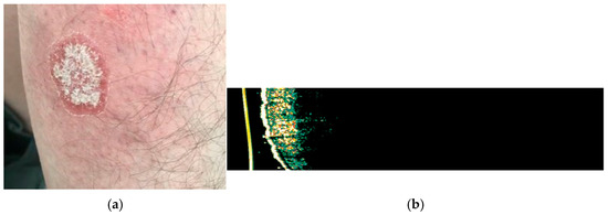 (a) Clinical appearance of erythematous-squamous plaque psoriasis on the right forearm; (b) HFUS analysis with Dermascan C USB® (20 MHz B-mode) of the examined psoriasis plaque showing thickening of epidermis with a hyperechogenic band, which represents hyperkeratosis and parakeratosis accompanied by hypoechogenic band, corresponding to the elongation of the dermal papillae.