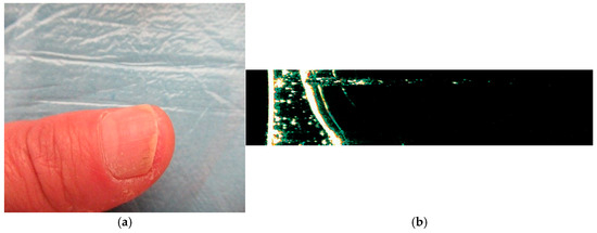 (a) Clinical appearance of psoriatic onychopathy of the right thumb with longitudinal striations and leukonychia; (b) HFUS examination (Dermascan C® 20 MHz) of the right thumb indicates the bilaminar nail plate which is thickened and has hyperechoic irregularities, with nail bed changes as thickening and the bone plane of the distal phalanx (own collection).