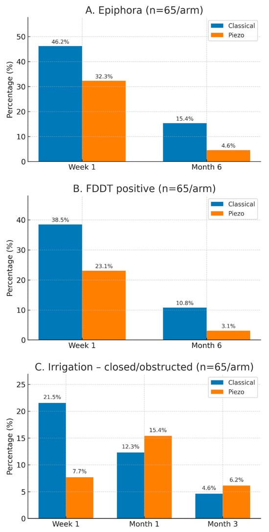 Table 3 summarizes lacrimal outcomes at each time point. At 1 week, the piezo group had significantly less epiphora (32.3% vs. 46.1%, p = 0.041), fewer positive FDDTs (23.0% vs. 38.4%, p = 0.045), and fewer irrigation obstructions (7.6% vs. 21.5%, p = 0.026) than the classic group. By 1 and 3 months, all measures still favored piezo but did not reach significance (e.g., epiphora 13.8% vs. 24.6% at 1 month, p = 0.062; 4.6% vs. 7.7% at 3 months, p = 0.088). At 6–12 months, the piezo group again showed significantly fewer chronic epiphora (4.6% vs. 15.4%, p = 0.031) and lower FDDT positivity (3.1% vs. 10.8%, p = 0.048). Irrigation blockage differences had equalized (15.4% vs. 12.3% at 1 month, p = 0.80; 6.2% vs. 4.6% at 3 months, p > 0.99). Punctal stenosis/occlusion remained very rare in both groups (<2%) with no significant difference.