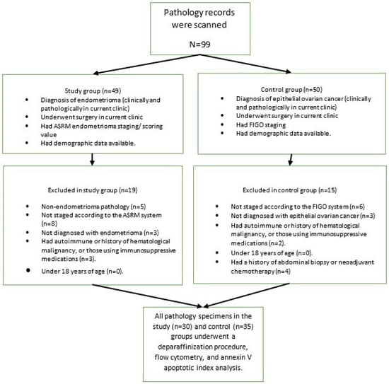 For this study, 30 endometrioma patients, who consecutively applied to the clinic where the study was conducted and met the inclusion criteria, were selected as the study group; then, 35 epithelial ovarian cancer patients, who consecutively applied to the clinic where the study was conducted and met the inclusion criteria, were selected as the control group. The flow chart of patient selection is presented in Figure 1.