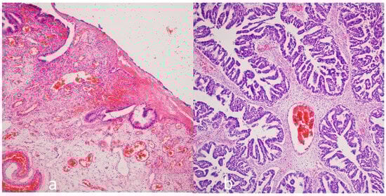 Sample microscopic appearance of ovarian endometrioma (endometrial glands associated with the surface are observed in the endometrioma cyst wall (a)) and ovarian carcinoma (neoplastic glands associated with ovarian carcinoma containing papillary structures (b)) (Hematoxylin & Eosin staining × 100).