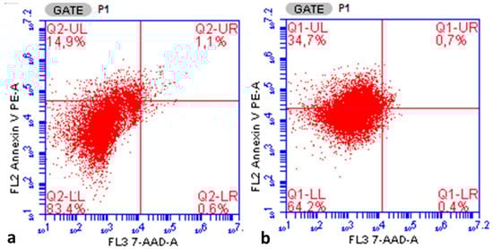 An example of a flow cytometry output showing the annexin V staining ratio of one case in the ovarian endometrioma group (a) and one case in the ovarian cancer group (b). 7-AAD (7-Amino-Actinomycin D) and PE (phycoerythrin) are the DNA dye used to assess cell viability in flow cytometry. The abbreviation FL stands for “Fluorescence,” and each number represents a different detector channel. FL2 (Fluorescence Channel 2), FL3 (Fluorescence Channel 3). The designation 7/AAD-A indicates a measurement made with 7-AAD dye in channel FL3. The letter “A” usually represents the “Area” parameter. Quadrant Gates. Q1-UL (Quadrant 1—Upper Left), Q2-UR (Quadrant 2—Upper Right), Q1-LL or Q3-LL (Lower Left), Q2-LR or Q4-LR (Lower Right).