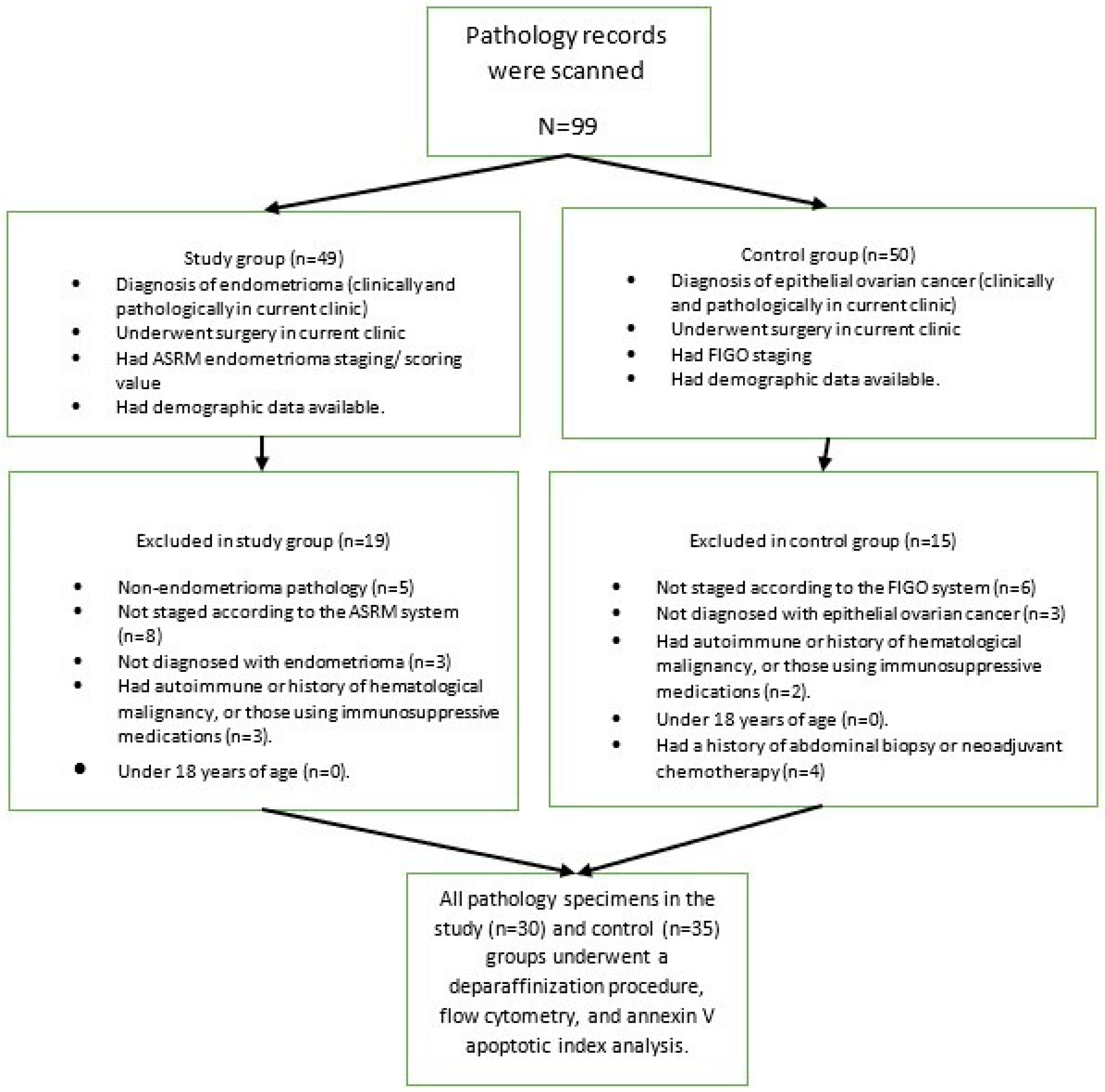 For this study, 30 endometrioma patients, who consecutively applied to the clinic where the study was conducted and met the inclusion criteria, were selected as the study group; then, 35 epithelial ovarian cancer patients, who consecutively applied to the clinic where the study was conducted and met the inclusion criteria, were selected as the control group. The flow chart of patient selection is presented in