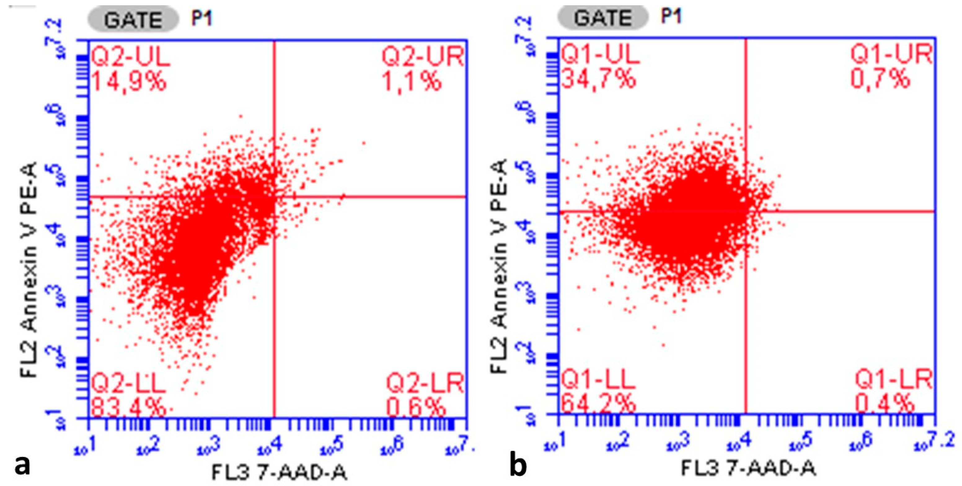 The device produces a DNA histogram as the result of the analysis. From this histogram, data were obtained that showed the percentage of cells in the G0/G1 phase, G2/M phase, and S phase. The formula (S + G2/M)/(G0/G1 + S + G2/M) × 100 was used to calculate the proliferation index. Annexin V staining curve data were also obtained from another histogram.