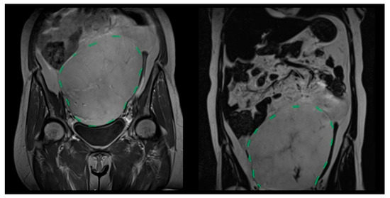 Figure 1. Coronal T2-weighted MRI showing a giant primary mesenteric liposarcoma extending from the pelvis to the upper abdomen (green dashed line indicates the tumor boundary).
