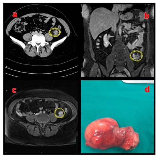 Figure 3. (a) Preoperative axial MRI showing the mesenteric mass (sigmoid colon mesentery) outlined in yellow; (b) Coronal MRI showing the same mass outlined in yellow; (c) Axial T2-weighted MRI confirming the lesion (outlined in yellow); (d) Macroscopic view of the resected specimen with negative surgical margins.
