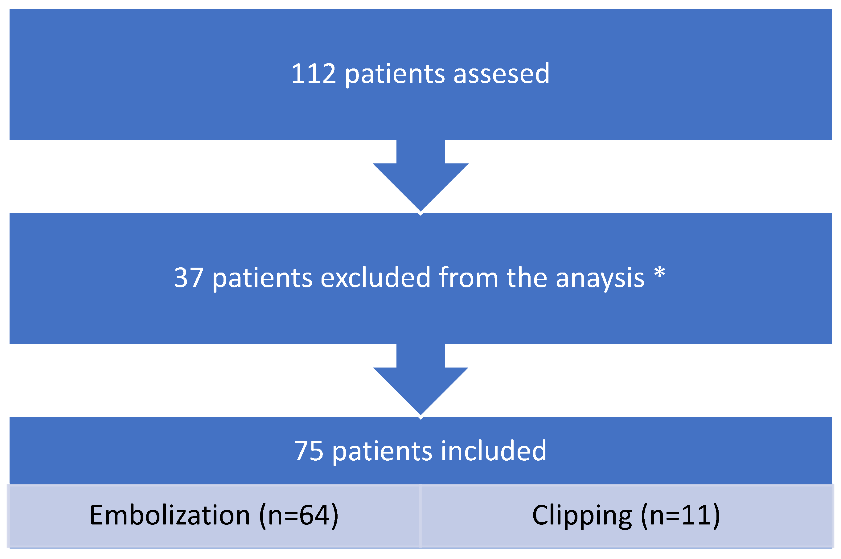 From December 2023 to October 2024, 112 patients with unruptured intracranial aneurysms were eligible for treatment. Seventy-five patients (67.0%) who met the inclusion criteria were included in the further analysis. The most common reasons for exclusion were: subarachnoid hemorrhage (