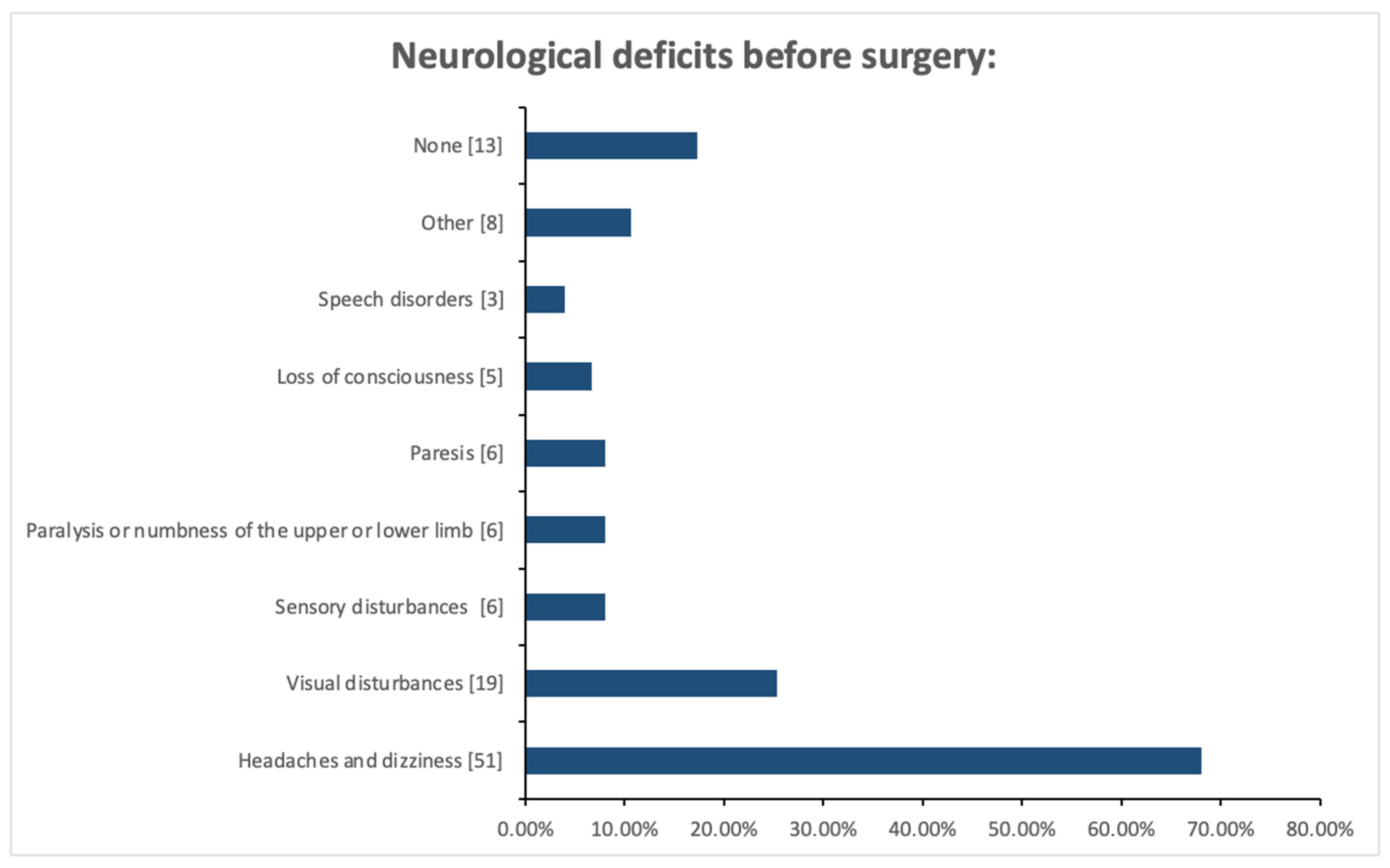 Figure 3) illustrate the types of neurological deficits occurring in patients before the procedure. The most frequently reported neurological deficit before the procedure was headache and dizziness (