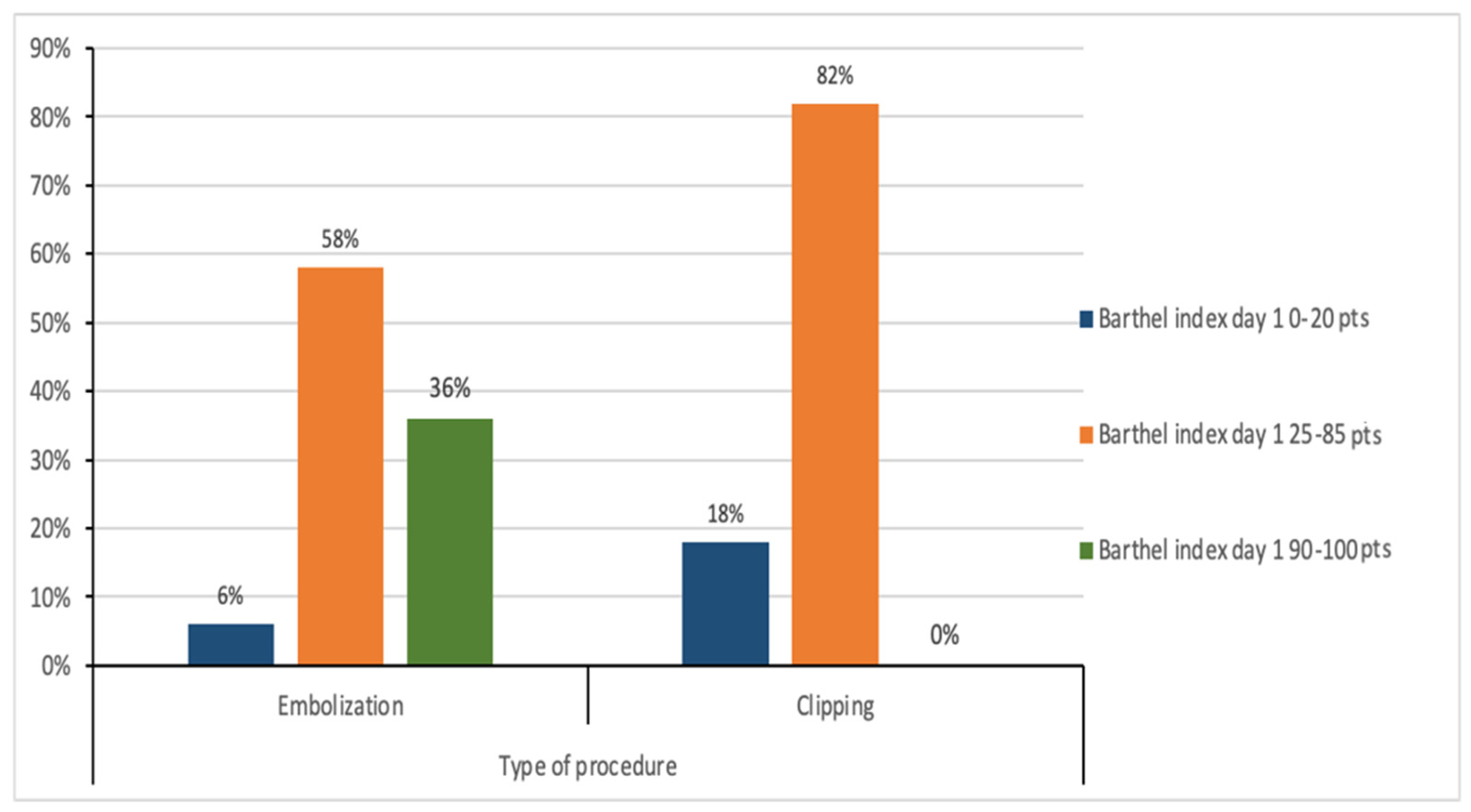Figure 5 illustrate the relationship between the type of procedure and the Barthel Index on the first day after the procedure. In the group of patients undergoing embolization, four people (6.25%) achieved a Barthel index of 0–20 points, 37 patients (57.81%) achieved an index of 25–85 points, and 23 people (35.94%) achieved an index of 90–100 points. In the group of patients undergoing clipping, two people (18.18%) achieved a Barthel index of 0–20 points, nine patients (81.82%) obtained an index of 25–85 points, and no person (0.00%) achieved an index of 90–100 points. The chi-square test showed a statistically significant relationship between the type of surgery and the Barthel index on the first day after surgery (χ