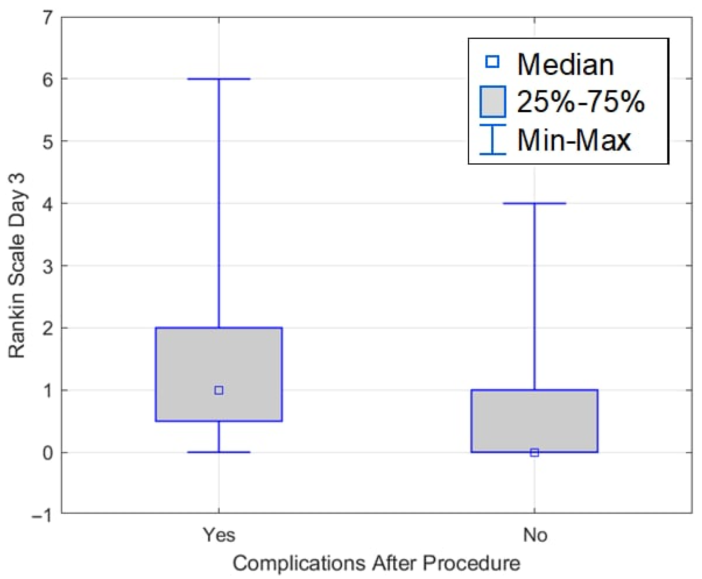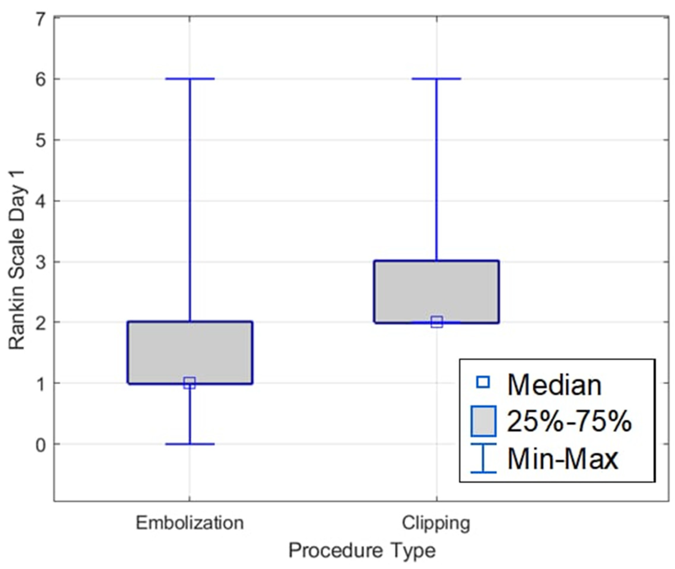 The average Rankin Scale value on the first day after embolisation was 1.53 (SD = 1.07), and the median was 1.00 (IQR = 1.00). The lowest value was 0.00, and the highest was 6.00. However, in the group of patients who underwent clipping, the mean value was 2.73 (SD 1.19), and the median was 2.00 (IQR = 1.00). Statistically, significantly lower Rankin Scale values were found on the first day in the group of patients after embolisation than after clipping (Z = −3.49,