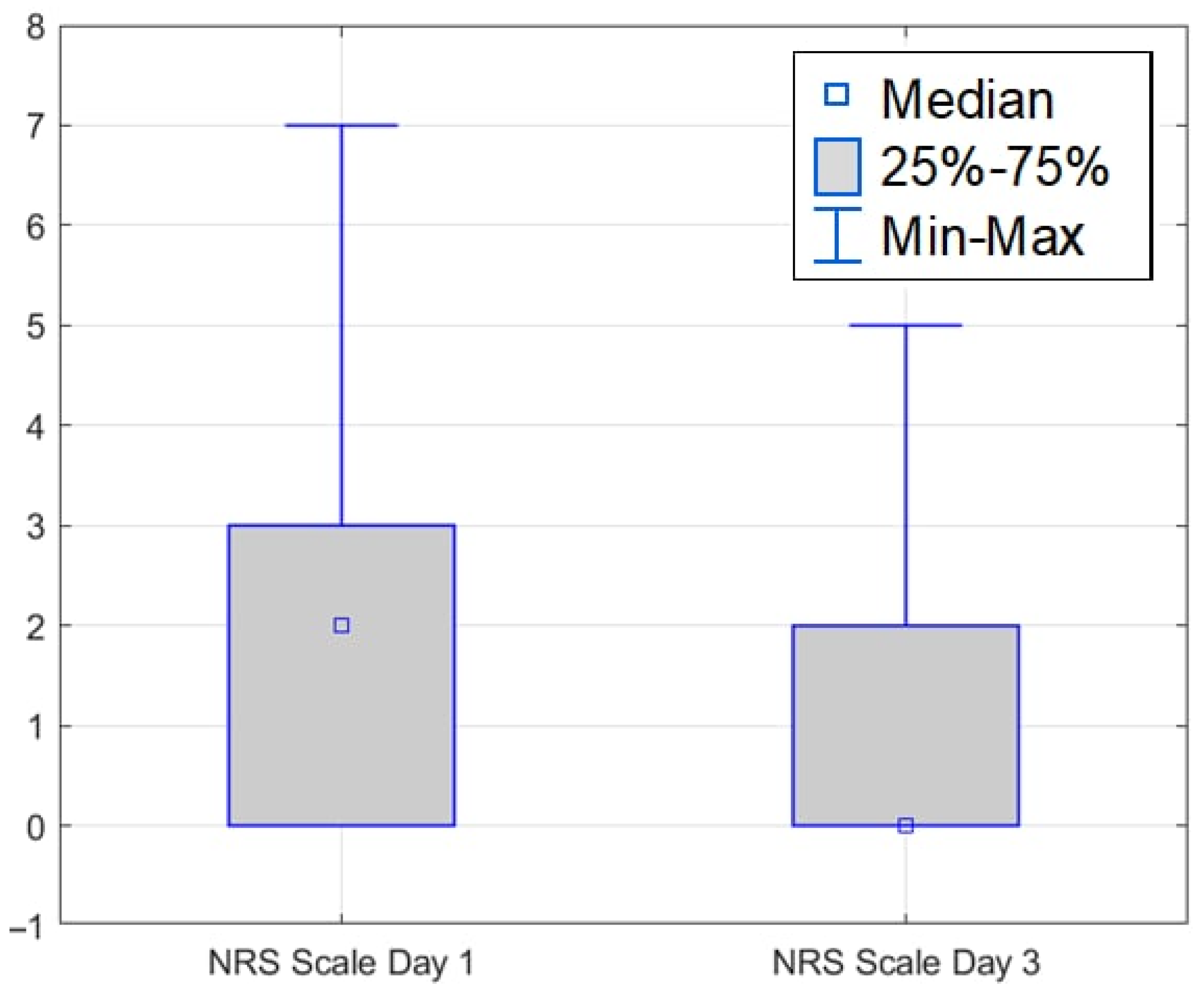 The average NRS score on the first day was 2.00 (±1.97), while on the third day the average score was 0.89 (±1.32). It was shown that the mean NRS score decreased by 1.11 (±1.64). The decrease was found to be statistically significant (Z = 4.87;