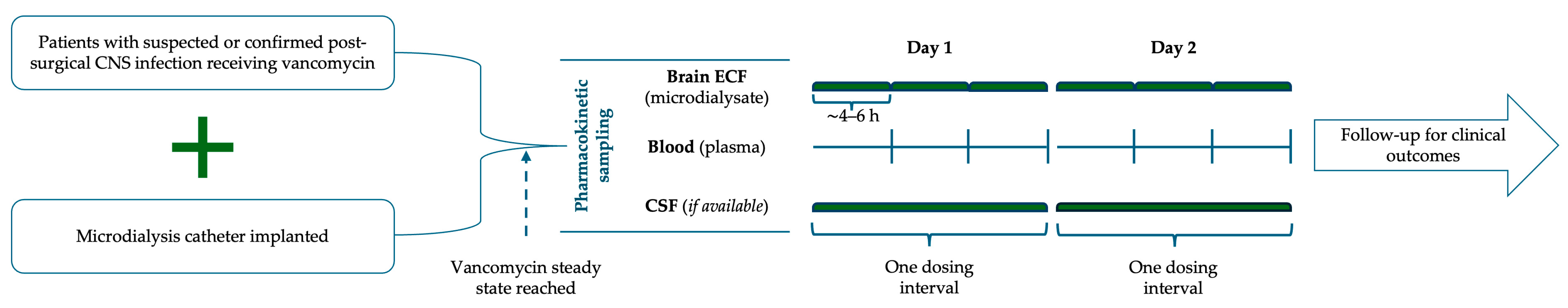 - Žukaitienė, S.; Žygaitė, A.; Milkintaitė, G.; Pancerė, J.; Balčiūnienė, N.; Vitkauskienė, A.; Mačiulaitis, R. An In Vitro Calibration Model for Vancomycin Quantification in Brain Extracellular Fluid: Toward Improved Dosing in Postoperative Infections. Pharmacol. Res. Perspect. 2025, 13, e70179. [Google Scholar] [CrossRef]