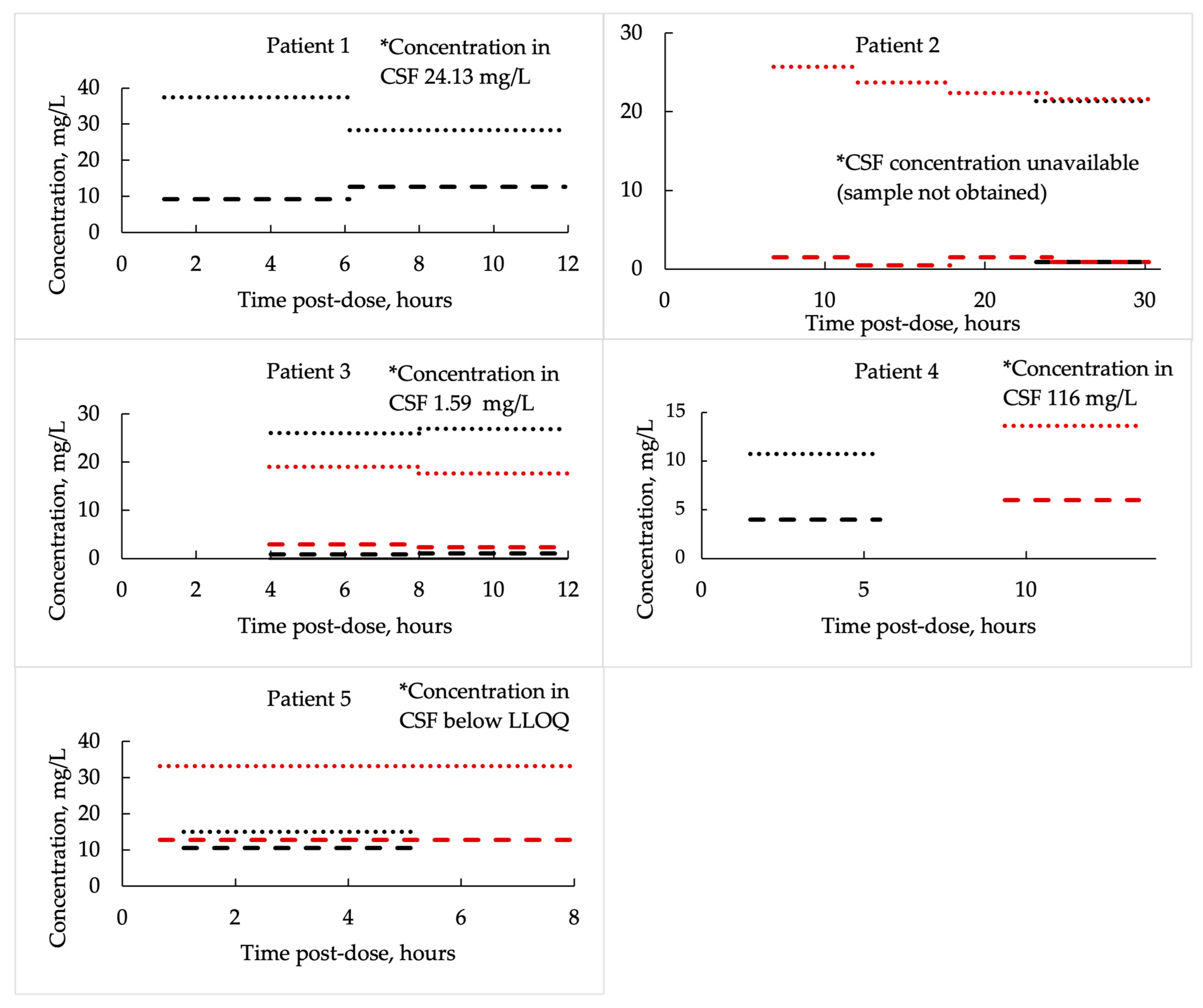 | Patient | Post-Dose Time (h) | Concentration, mg/L | ECF/Plasma Ratio | ECF/Plasma Ratio (0.7) * | ECF/Plasma Ratio (0.45) * | |||