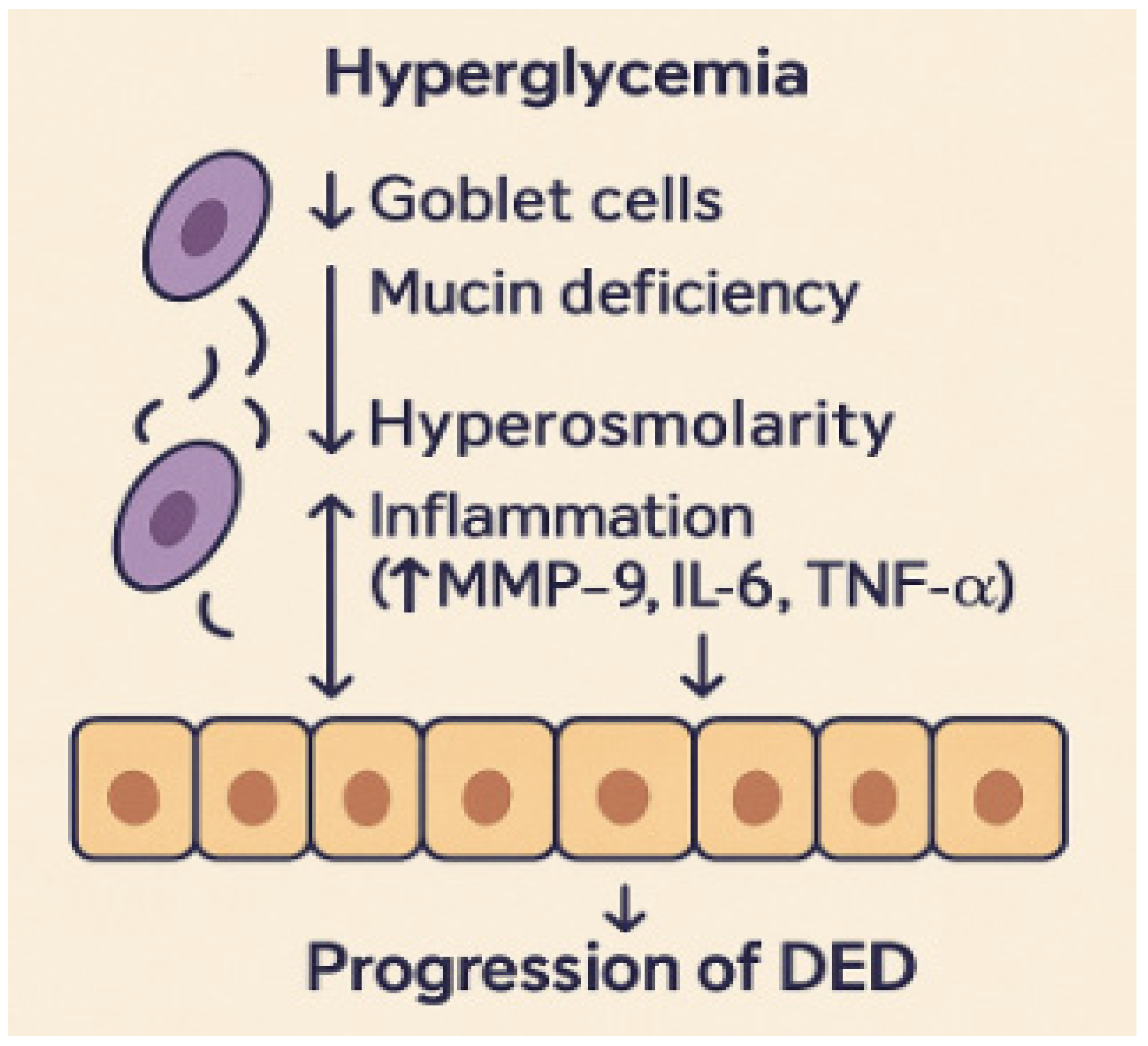 41] and directly impacts the ocular surface. Chronic hyperglycemia results in an increase in inflammatory cytokines, including interleukin-1β (IL-1β), tumor necrosis factor-alpha (TNF-α), and matrix metalloproteinase-9 (MMP-9) in tears and conjunctival tissues. These molecular changes are mechanistically linked to disruption of epithelial barrier integrity, reduction in goblet cell density, and increased immune cell infiltration [