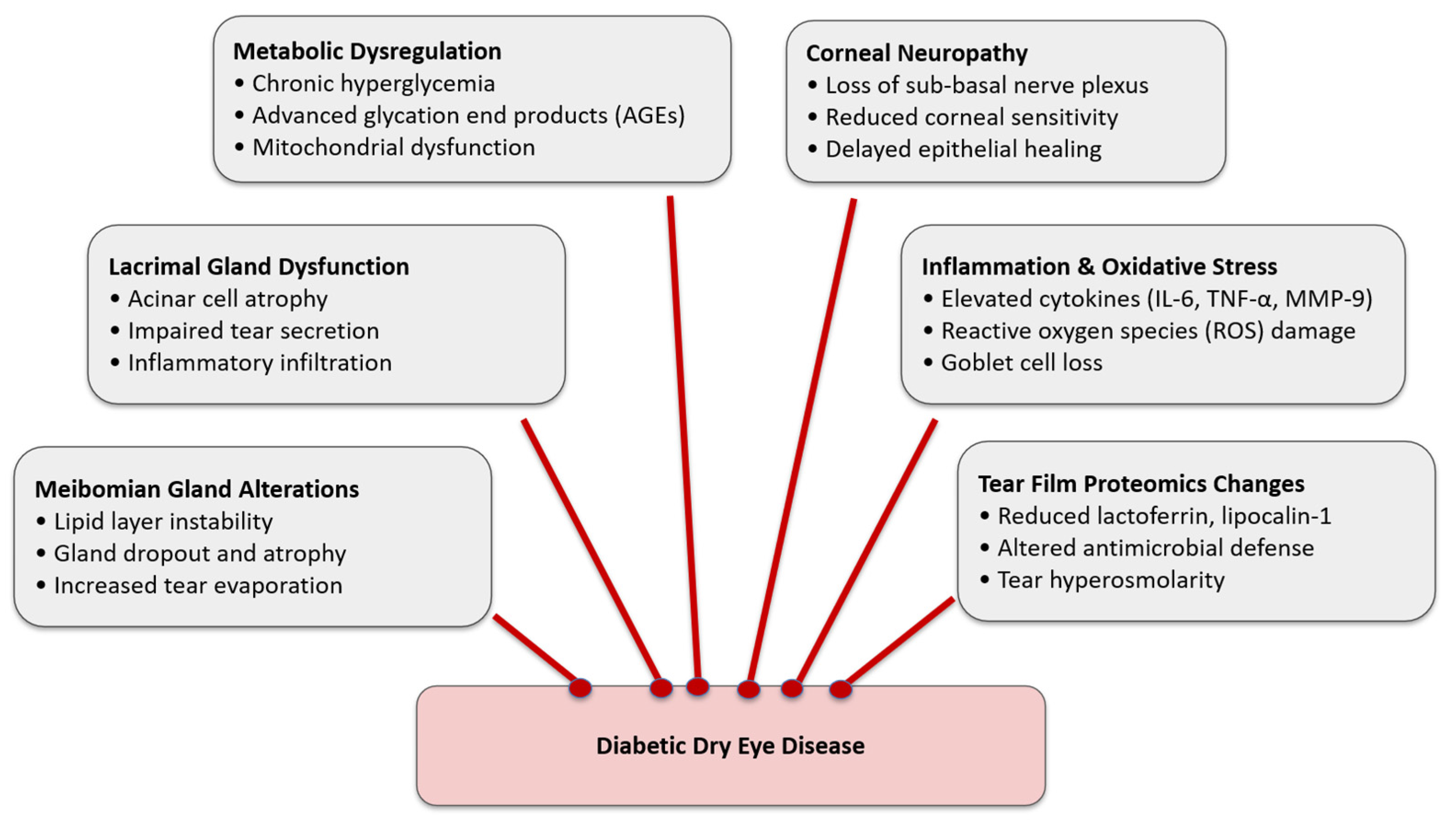 Dry eye disease (DED) is conventionally defined as a multifactorial disease of the ocular surface, characterized by instability of the tear film, pain, and visual impairment. DED represents a significant global health issue, affecting an estimated 5–30% of the population worldwide, with prevalence rising with age and comorbidities such as diabetes. Beyond its ocular implications, DED imposes a considerable socioeconomic burden due to its chronic nature and its impact on visual function and quality of life. DED can arise in the general population through a multifactorial interplay of age-related changes, hormonal dysregulation, environmental stress, and immune-mediated mechanisms. These factors contribute to lacrimal gland hypofunction, meibomian gland obstruction, and epithelial instability, leading to tear film hyperosmolarity and chronic low-grade inflammation. While typically linked to autoimmune diseases, aging, or environmental factors, its occurrence in metabolic disorders like diabetes mellitus is becoming increasingly recognized [