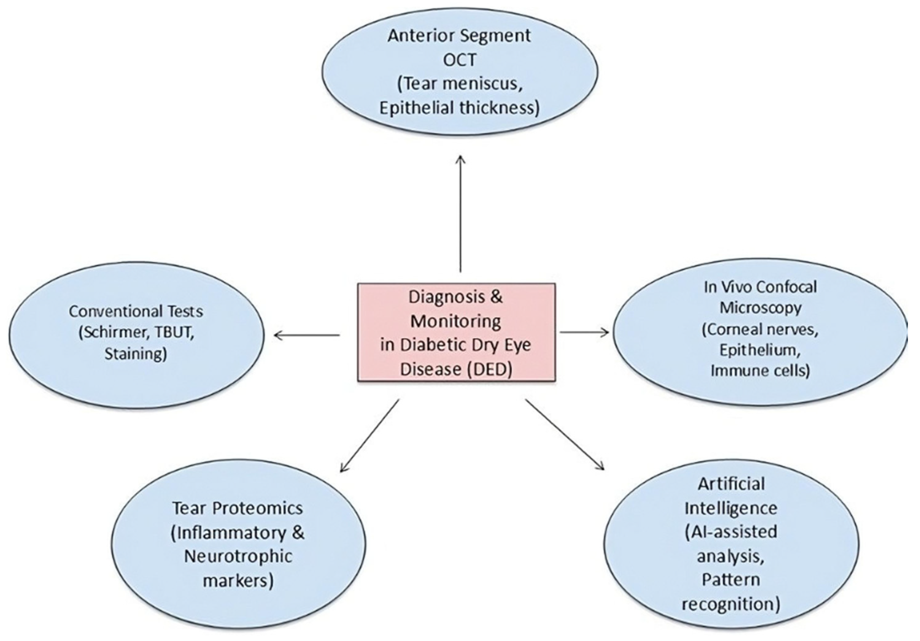 Dry eye disease in individuals with diabetes mellitus is a complicated, multifaceted, and often underappreciated syndrome that substantially impacts quality of life and visual performance. The pathophysiology involves complex interactions among chronic hyperglycemia, inflammatory mediators, neurotrophic deficiencies, and proteomic changes in the tear film, rather than merely tear shortage. These alterations indicate a more extensive systemic dysregulation, rendering the ocular surface a discernible and accessible indicator of diabetes disease burden. Impairment of the lacrimal gland, degradation of corneal nerves, activation of inflammatory cytokines, and dysregulation of tear film proteins together contribute to the distinctive clinical picture of diabetes dry eye. These processes not only aggravate ocular surface disease but also obscure early signs, postponing diagnosis and therapy. In this context, enhancing diagnostic methodologies—such as in vivo imaging, tear biomarker analysis, and AI-assisted platforms—provides a means to improve detection and management.