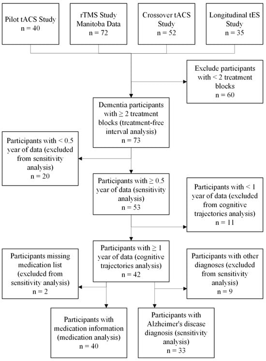 Participants were enrolled in a series of non-invasive interventions involving tES [,,], rTMS [], and/or CT. This analysis included 73 participants with dementia who received between 2 and 9 treatment blocks; each block was 20 sessions over 4 weeks with the exception of one block of treatment that was 10 sessions over two-weeks of rTMS treatment (n = 7) and one block of treatment that was 24 sessions over 8 weeks tACS paired with CT treatment (n = 2). Participants were recruited through posters posted throughout the community and physicians’ referrals, and all clinical trials were conducted at Riverview Health Centre in Winnipeg, MB, Canada. Figure 1 shows a flowchart of the above-mentioned studies and inclusion of the participants. Table 1 summarizes participant flow for each source study, including total enrollment, number who completed the study, number who withdrew, and number whose data were included in this analysis. For the first three studies [,,,], all participants included in this analysis completed the study, and there were no withdrawals. For the first study [,], withdrawals occurred either due to the COVID-19 pandemic or participants choosing not to continue after completing a treatment block. For the second study [], reasons for withdrawal are detailed in [] with a full analysis of attrition. For the third study [], withdrawal reasons are summarized in Table 1 of the original publication. For the fourth study [], it is ongoing and thus, most participants have not yet completed the study which involves multiple treatment blocks with washout periods in between. The analysis for this study used the data available up to 3 September 2025. All clinical trials received ethics approval from the University of Manitoba Biomedical Research Ethics Board and were registered on ClinicalTrials.gov site online. Informed consent was obtained from all participants prior to their enrollment in each of the original studies included in this analysis.