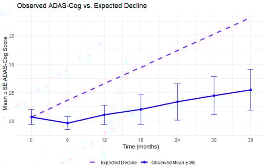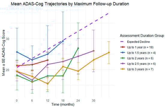 To contextualize the observed slope, we conducted a one-sample t-test comparing the rate of ADAS-Cog change in this cohort to the average AD progression rate reported in a meta-analysis of 140 clinical trials (0.485 points/month) []. Robust standard errors were used to account for potential violations of independence assumption inherent to repeated measures data. The observed slope (0.23 ± 0.07, 95% CI: 0.09 to 0.37) was significantly lower than the expected rate (t = −3.59, df = 163.04, p < 0.001), suggesting that participants in this study experienced slower-than-expected cognitive decline. Figure 2 shows the observed ADAS-Cog trajectory alongside the expected decline in untreated AD. Figure 3 shows a similar plot with observed ADAS-Cog scores stratified by maximum assessment duration.