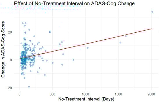Association between no-treatment interval and change in ADAS-Cog score. Each point represents an observation from an individual participant. The solid red line indicates the fitted relationship from the robust mixed-effects model, showing an overall positive association between longer no-treatment intervals and greater cognitive decline.