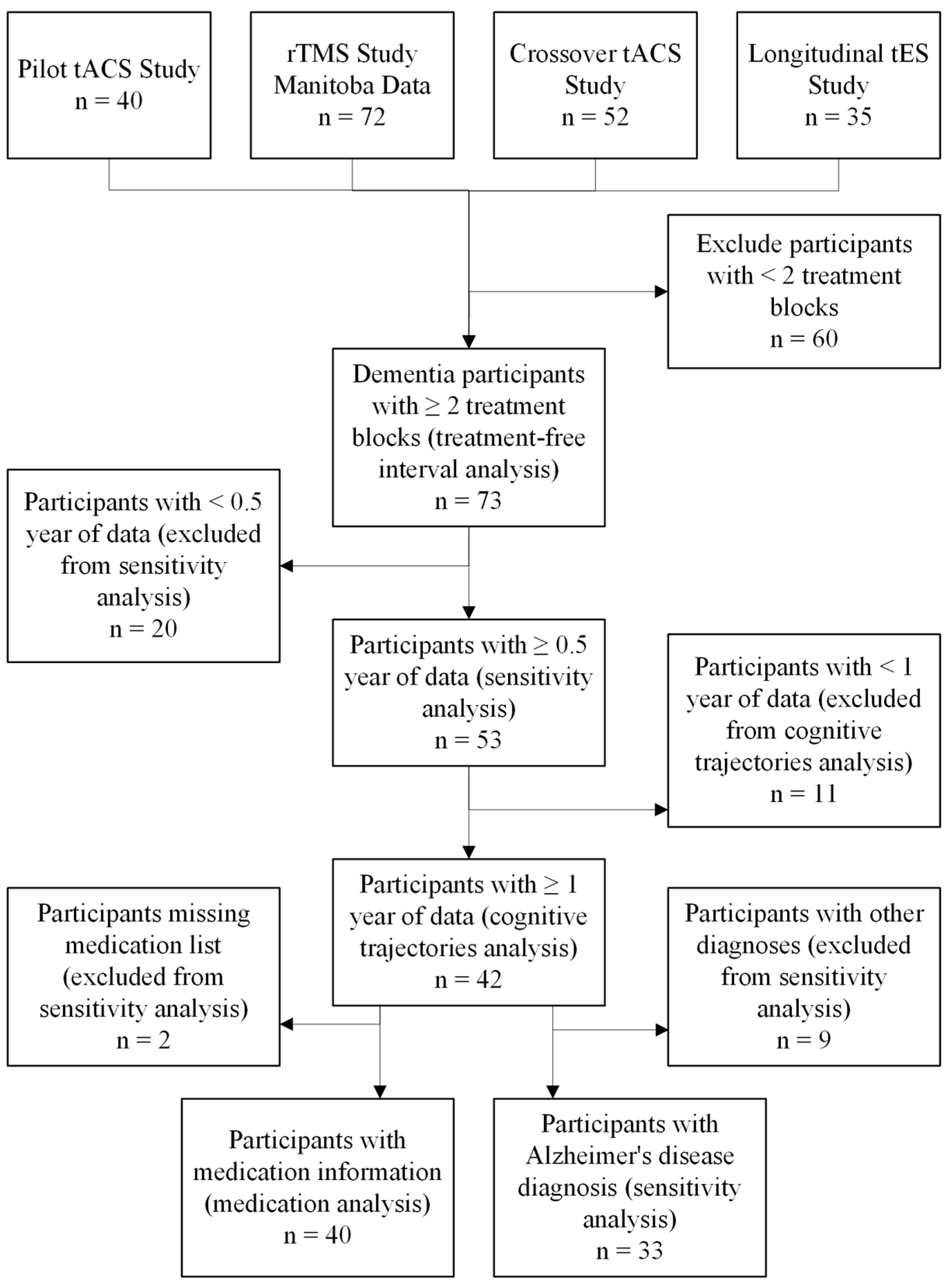 - Bretecher, C.A.; Verot, A.; Teschuk, J.M.; Uehara, M.A.; Fitzgerald, P.B.; Koski, L.; Lithgow, B.J.; Moussavi, Z. Quantitative Analysis of Factors of Attrition in a Double-Blind RTMS Study for Alzheimer Treatment. Alzheimer Dis. Assoc. Disord. 2024, 38, 288–291. [Google Scholar] [CrossRef] [PubMed]