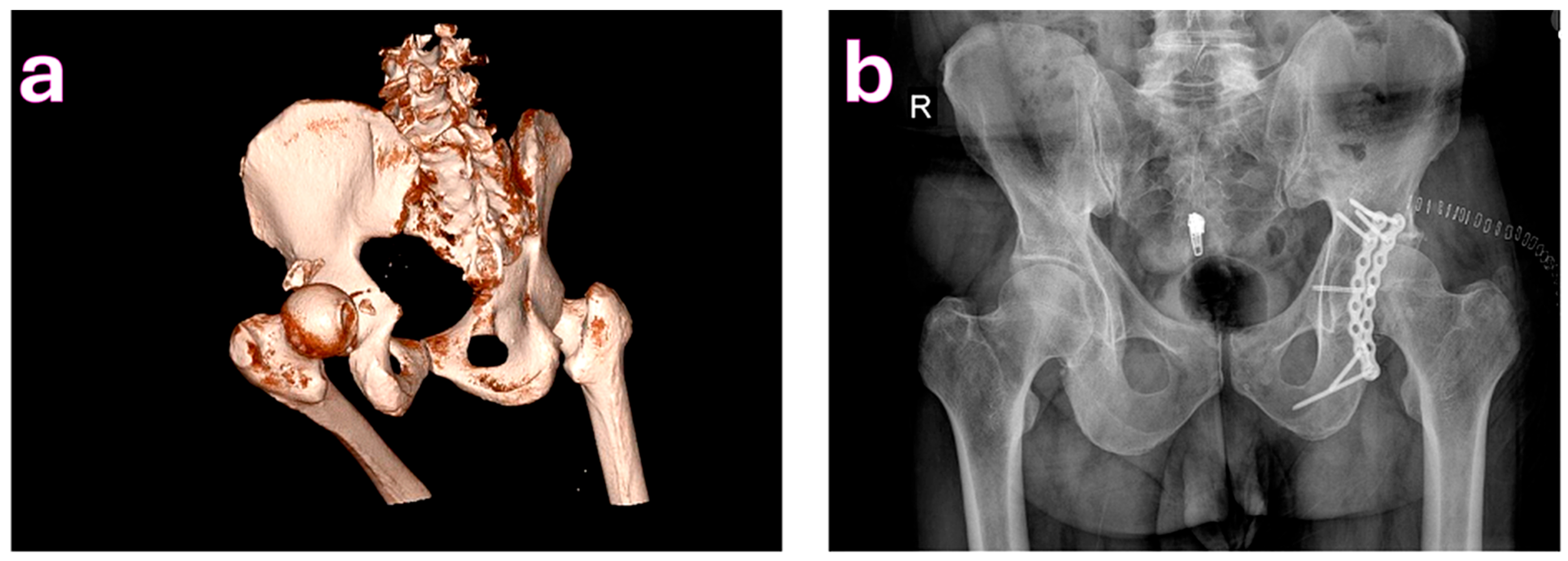 - Orth, M.; Osche, D.; Pohlemann, T. Management of complications of acetabular fractures. Unfallchirurgie 2023, 126, 109–118. [Google Scholar] [CrossRef] [PubMed]
