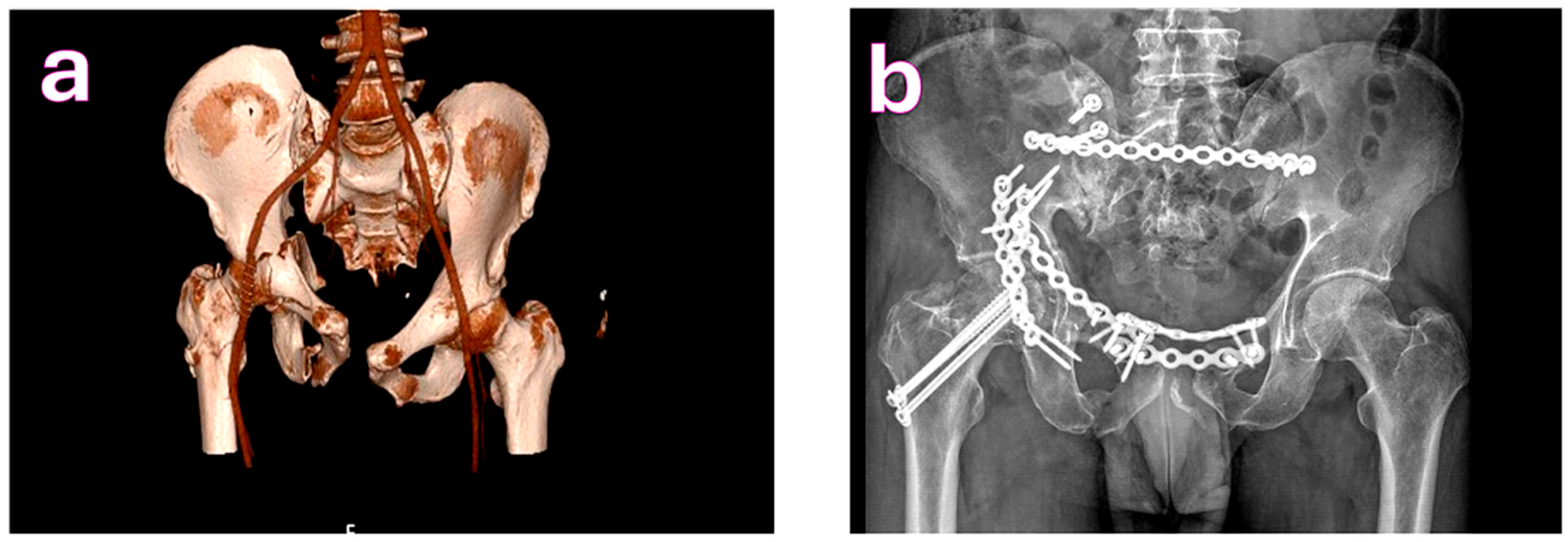 - Eastman, A.L.; Miller, A. Managing severe (and open) pelvic disruption. Trauma Surg. Acute Care Open 2025, 10, e001820. [Google Scholar] [CrossRef] [PubMed]