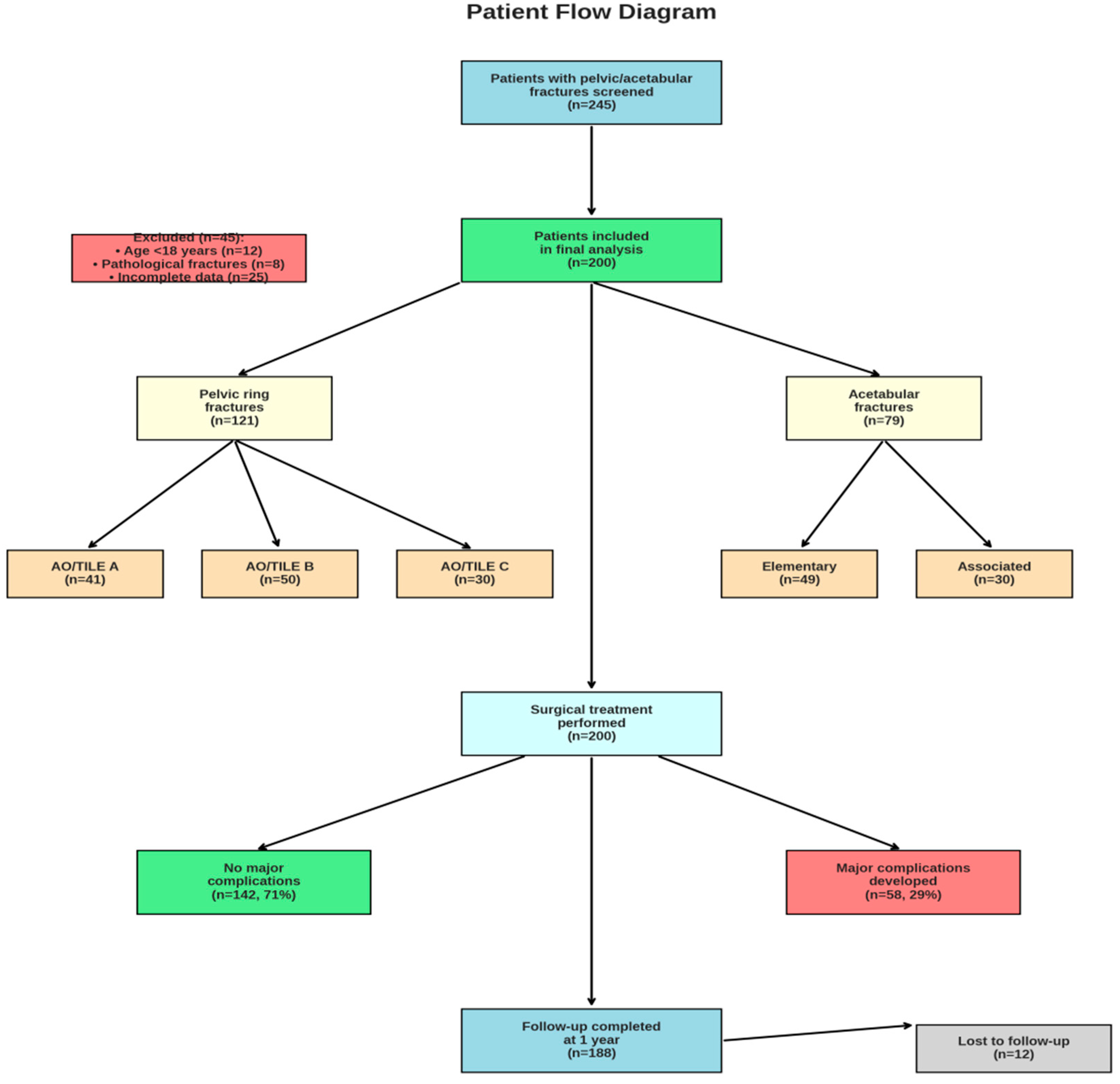 - Cuthbert, R.; Walters, S.; Ferguson, D.; Karam, E.; Ward, J.; Arshad, H.; Culpan, P.; Bates, P. Epidemiology of pelvic and acetabular fractures across 12-mo at a level-1 trauma centre. World J. Orthop. 2022, 13, 744–752. [Google Scholar] [CrossRef]