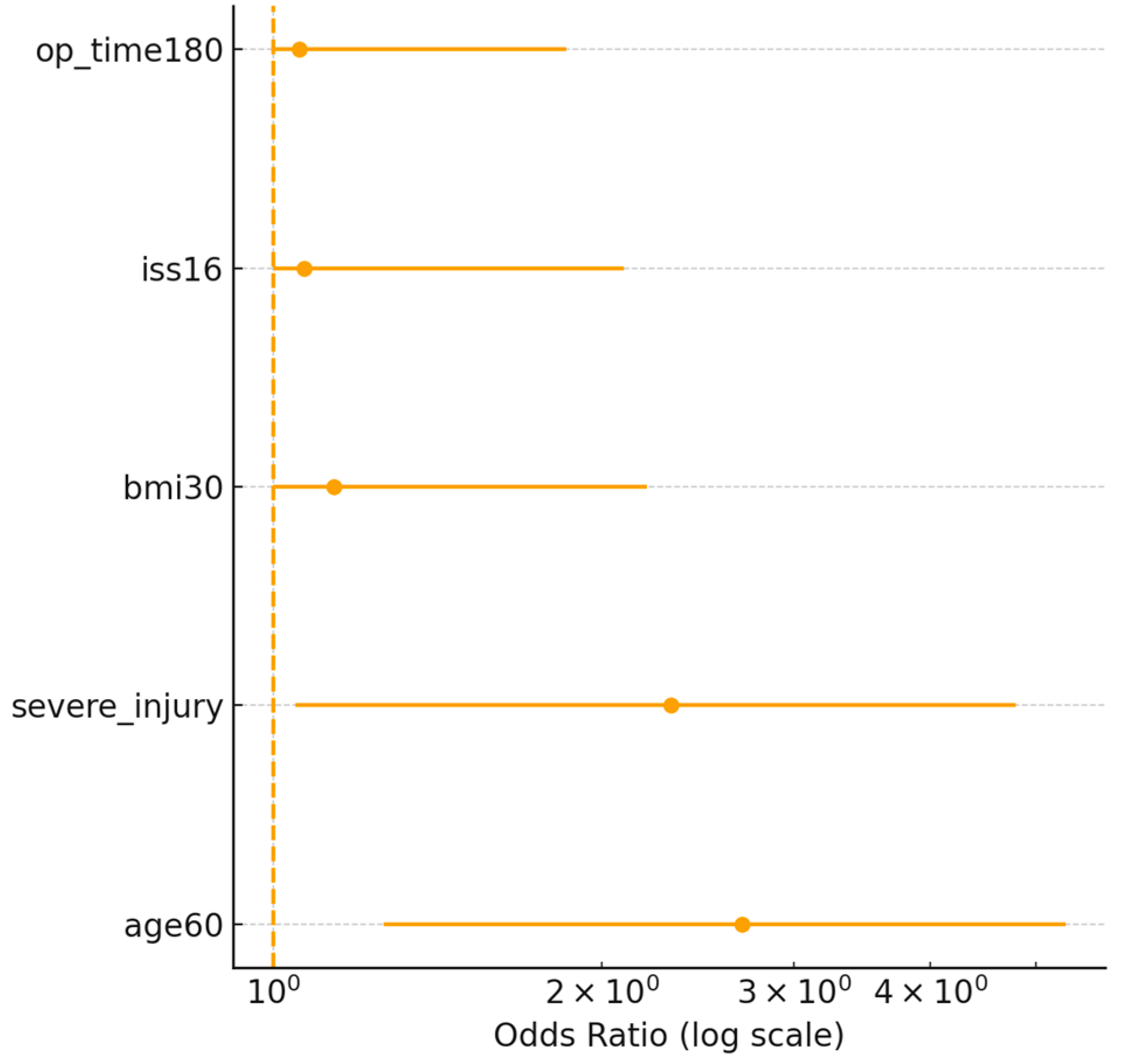 | Operative Duration | ≥180 min | 1 | 60 | 50 | Prolonged surgery indicating complexity |