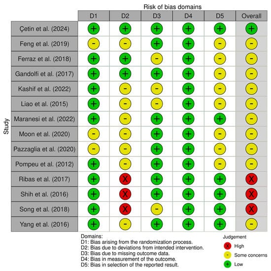 One study was assessed as having a low risk of bias across all domains []. Ten studies showed some concerns in one or more domains [,,,,,,,,,,,]. Three studies were classified as having a high risk of bias [,,]. Overall, the risk of bias was moderate, with most studies presenting some concerns and only a few demonstrating low risk across all domains. Figure 2 and Figure 3 present the risk of bias.