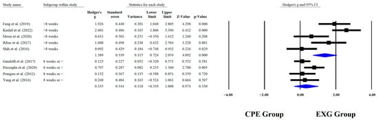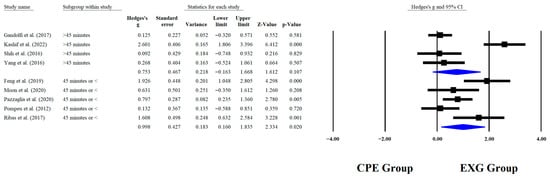 Forest plot of changes in BBS in older people with Parkinson’s disease participating in exergaming training compared with older people with obesity Parkinson’s disease assigned as conventional physical exercises with minutes per sessions [,,,,,,,,]. Values shown are effect sizes (Hedges’ g) with 95% confidence intervals (CI). CPE: conventional physical exercise; EXG: exergaming.