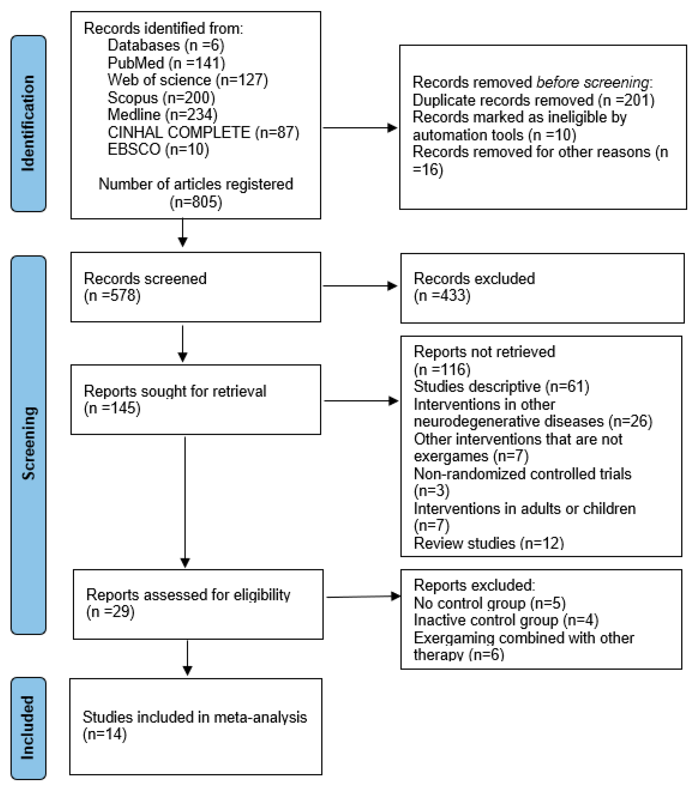 | Intervention | Interventions use EXG or active immersive and non-immersive video games (i.e., Wii sports, Balance and Fit, Switch Sports, Kinect Sports, Adventure and Your Shape, Sports Champions Move, NIRVANA) for 4 weeks or more. | Interventions that either did not involve EXG or combined EXG with other forms of physical therapy, and for which the intervention protocol was not clearly described. |
