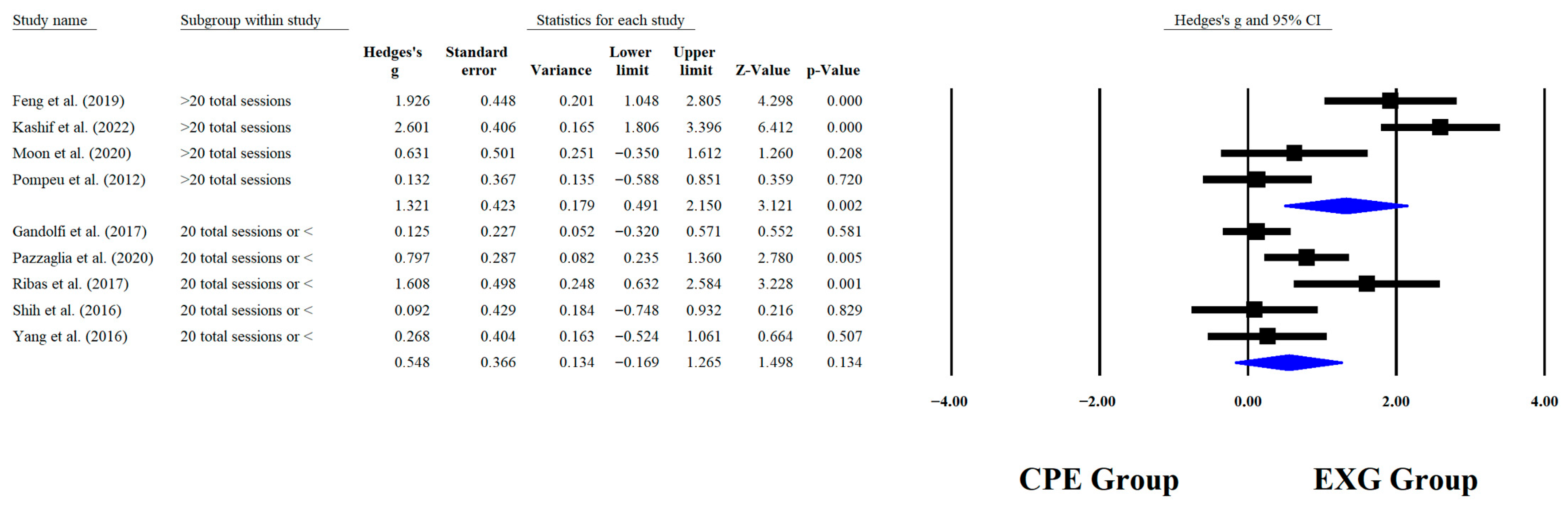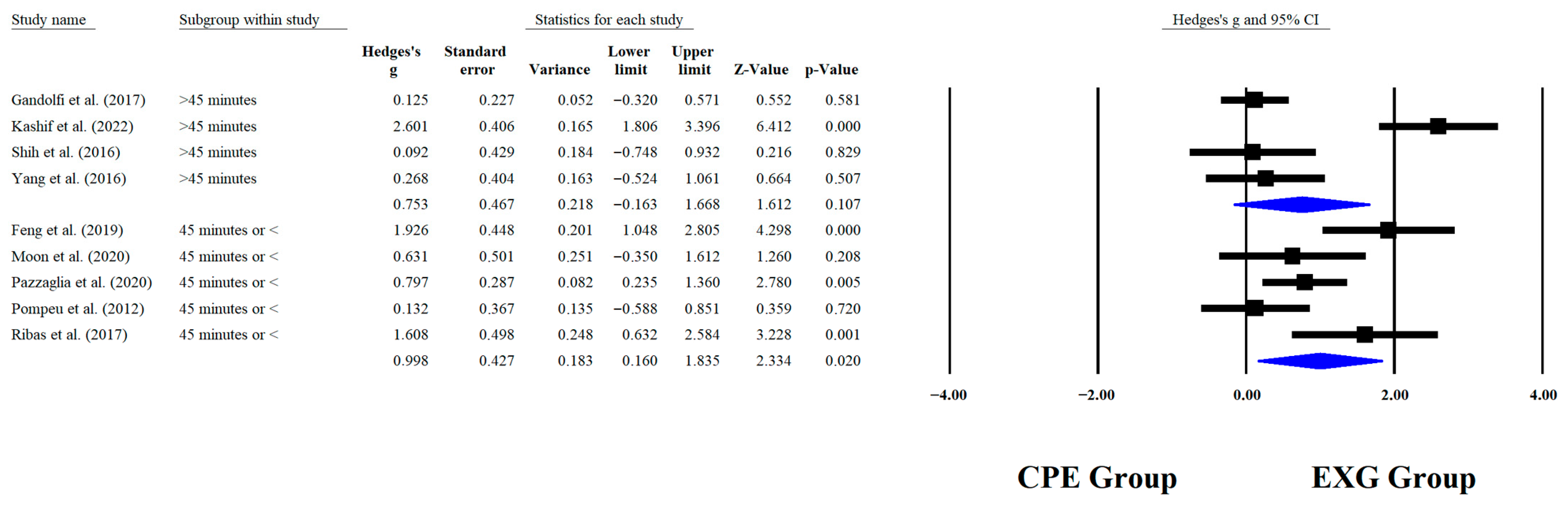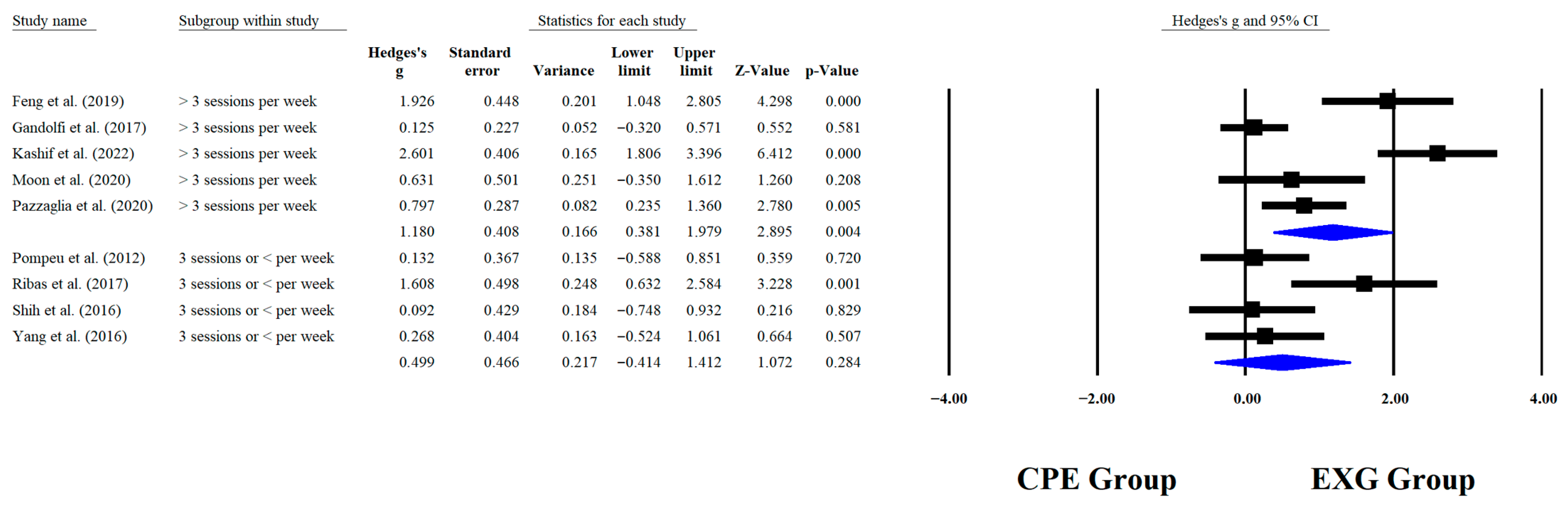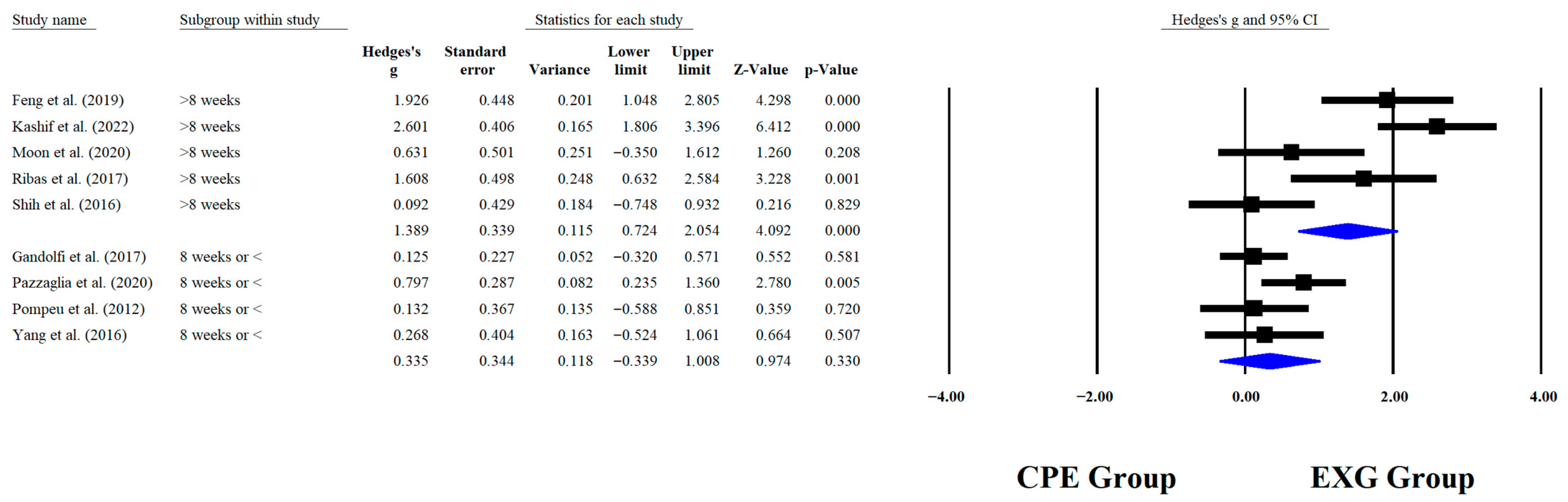4.7. Subgroup Analysis According to Training Duration Weeks