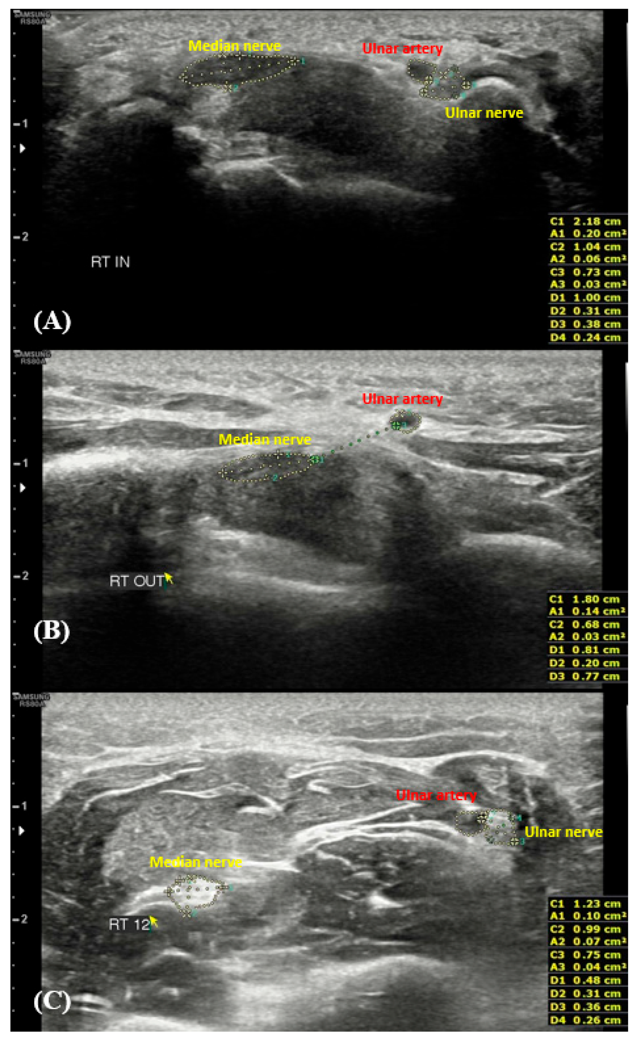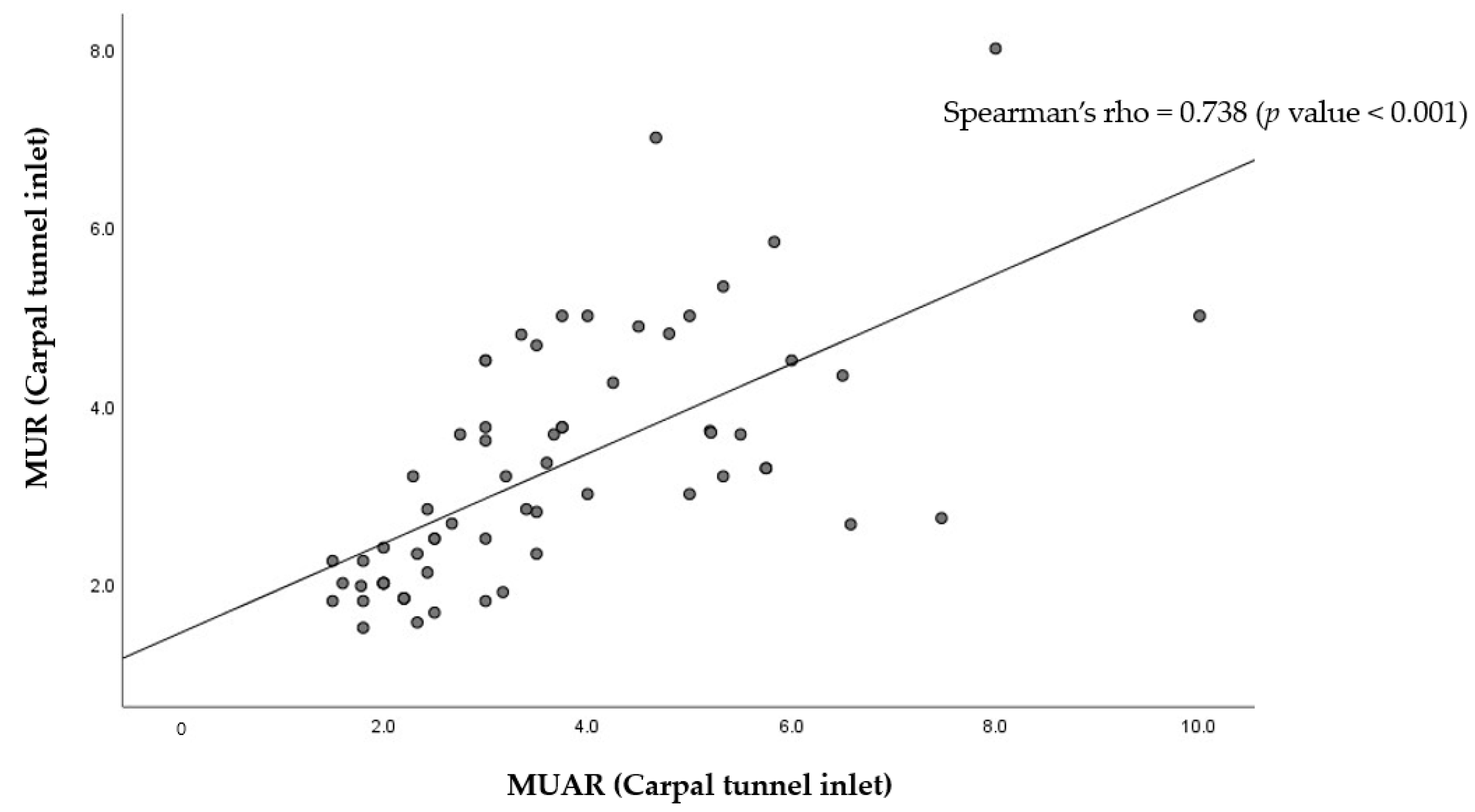 | Parameters | MUAR at the Carpal Tunnel Inlet | MUAR at the Carpal Tunnel Outlet | MUAR at 12 cm Proximal to the Distal Wrist Crease | |