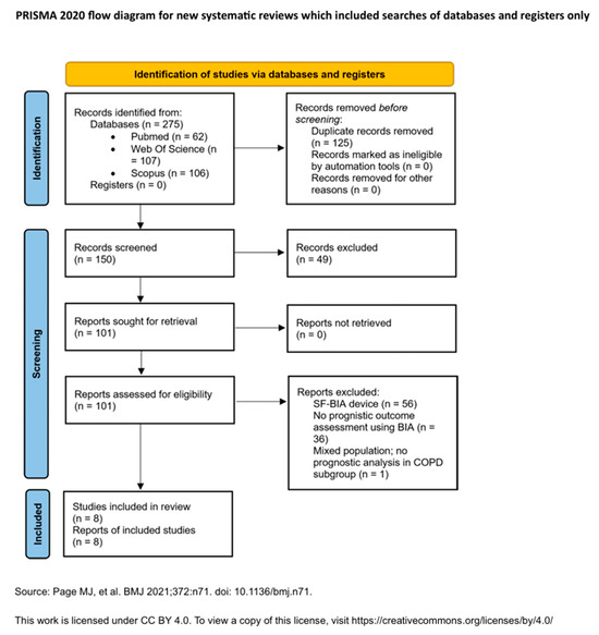 This systematic review aimed to evaluate the prognostic value of MF-BIA in patients with COPD. To ensure methodological consistency and clarity, studies were selected based on predefined eligibility criteria structured according to the PICOS framework: