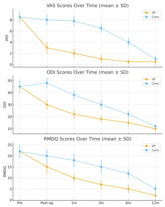 Pain intensity over time (VAS, mean ± SD). VAS (0–10), ODI (0–100), and RMDQ (0–24) values are expressed as mean ± standard deviation (SD); error bars represent SD. VP achieved a rapid decrease in VAS, ODI, and RMDQ values immediately after treatment and during the first three months, whereas improvement in the conservative group was slower and more gradual. At 12 months, both groups reached similar outcome levels.