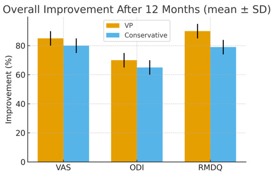 Functional outcome over time (ODI/RMDQ, mean ± SD). VAS (0–10), ODI (0–100), and RMDQ (0–24) values are expressed as mean ± standard deviation (SD); error bars represent SD. Percentage reduction of VAS, ODI, and RMDQ scores after 12 months compared with baseline values. Vertebroplasty showed greater early and overall improvement in all outcome measures, particularly within the first six months, allowing earlier functional recovery and return to daily activities.