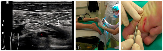 Removal of a deeply embedded splinter from the plantar surface under pRA with a tourniquet. (a) The three white arrows indicate the needle during tibial nerve anesthesia (white dotted oval) located above the tibial artery (AT). (b) During the procedure, the awake patient is placed in the prone position with a tourniquet applied to the lower leg. (c) The splinter can be removed without difficulty under complete tourniquet control, allowing full exploration of the wound.