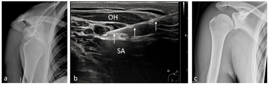 Figure 2. Reduction of an anteroinferior right-sided (R) shoulder dislocation under pRA. (a) Anteroposterior (AP) radiograph prior to reduction. (b) The three white arrows indicate the needle advancing beneath the superior trunk (white dotted oval) between the omohyoid muscle (OH) and the serratus anterior muscle (SA). (c) AP radiograph after correction of the dislocation.