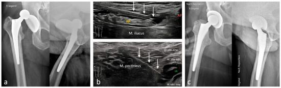 Figure 3. Reduction of a posterior hip total prosthesis dislocation under pRA. (a) Anteroposterior (AP) and axial radiographs prior to reduction. (b) Top: The three white arrows indicate the needle over the femoral nerve (NF, white dotted oval) above the iliacus muscle; the femoral artery (AF) is partially visible. Bottom: Anesthesia of the obturator nerve. The three white arrows indicate the needle during injection of local anesthetic between the adductor magnus and adductor brevis muscles. (c) AP and axial radiographs after reduction.
