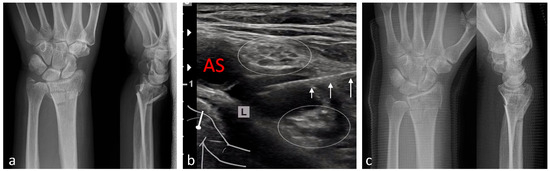 Figure 4. Reduction of a distal left-sided (L) radius fracture under pRA. (a) Anteroposterior (AP) and lateral radiographs prior to reduction. (b) The three white arrows indicate the needle during infraclavicular advancement and injection of local anesthetic between the lateral and medial fascicles of the brachial plexus (white dotted ovals). AS: subclavian artery. (c) AP and lateral radiographs after ultrasound-guided reduction in the fracture and application of a plaster splint in the ED.- Treatment of more extensive extremity injuries that could be managed directly in the ED as an alternative to operative management (Figure 5 and Figure 6);