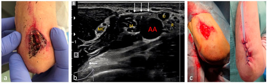 Figure 5. Management of a deep and heavily contaminated laceration-crush injury over the olecranon under pRA. (a) Pre-operative situation: remnants of soil and vegetation are visible extending down to the periosteum of the ulna. (b) Axillary brachial plexus block. The three white arrows indicate the needle advancing toward the ulnar nerve (U), which in this region lies in close proximity to the axillary artery (AA) together with the median (M) and radial (R) nerves. The musculocutaneous nerve (MC) has already entered between the biceps brachii and coracobrachialis muscles. (c) Intraoperative and post-debridement situation in the ED.