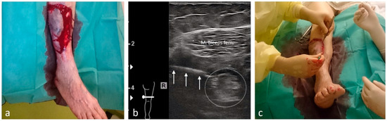 Figure 6. Management of a large pretibial degloving right-sided (R) injury under pRA. (a) Extensive degloving injury of the right lower leg in a 91-year-old patient. (b) The three white arrows indicate the lateral advancement of the needle between the vastus lateralis and biceps femoris muscles for a distal sciatic nerve block (white dotted oval). The local anesthetic is shown surrounding the nerve. (c) Intraoperative situation during management of the degloving injury in the ED. - Superficial injuries in the head–neck region, if an epifascial block was feasible (Figure 7);