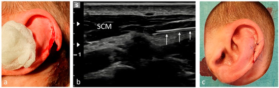 Figure 7. Anesthesia of the auricle for treatment of a traumatic helix laceration under pRA. (a) Laceration of skin and cartilage following a head impact during soccer. (b) The three white arrows indicate the needle advancing beneath the sternocleidomastoid muscle (SCM), where the internal branch of the great auricular nerve (GAN, white dotted oval) is located. The external branch of the GAN (white dotted oval) appears above the SCM after curving around its posterior border. (c) Post-procedural situation after repairing the helix. - Painful clavicular fractures, if a purely epifascial blockade of the supraclavicular nerves was possible (Figure 8);